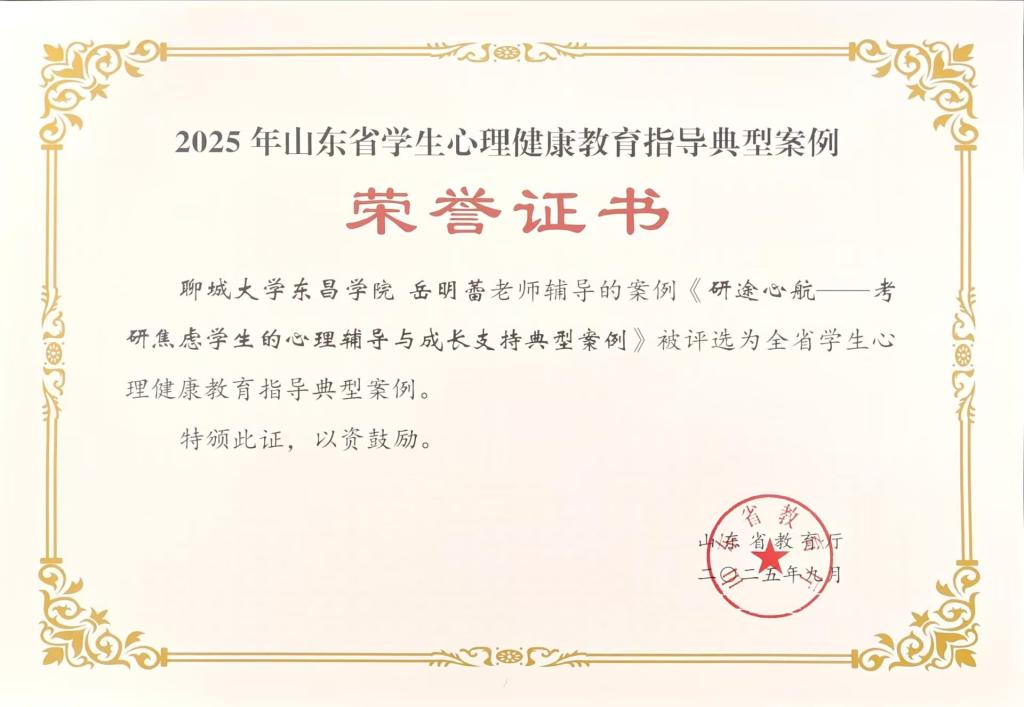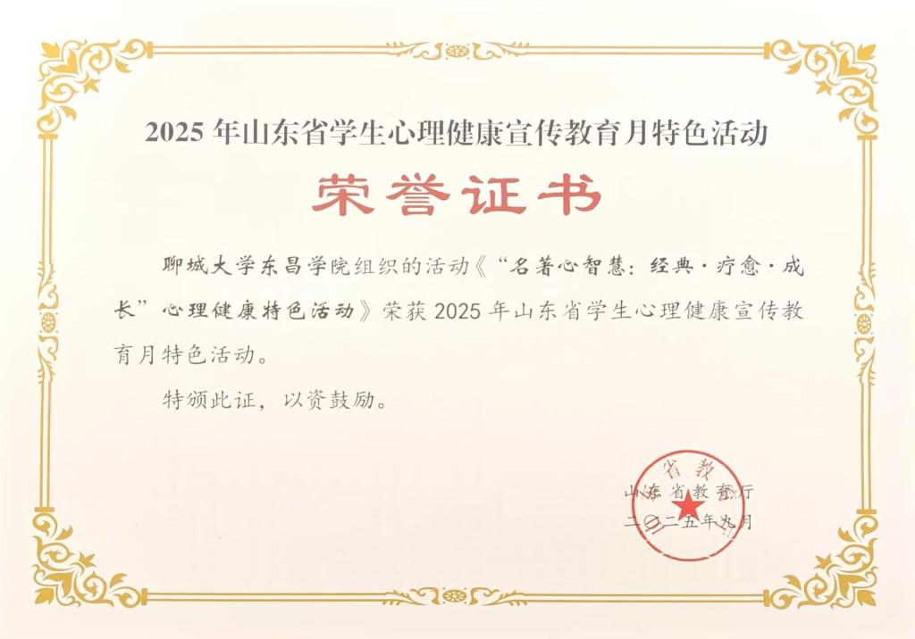 山东省学生心理健康宣传教育月活动由山东省教育厅、中共山东省委宣传部、山东省卫生健康委员会和山东省关心下一代工作委员会联合举办,旨在推进学校心理健康教育提升行动,进一步加强人文关怀和心理疏导,培育学生积极心理品质,提高全省大中小学心理健康教育工作水平。我校学生工作处申报的《“名著心智慧:经典·疗愈·成长”心理健康特色活动》,入选全省学生心理健康宣传教育月特色活动名单;岳明蕾老师撰写的《研途心航——考研焦虑学生的心理辅导与成长支持典型案例》,入选全省学生心理健康教育指导典型案例。