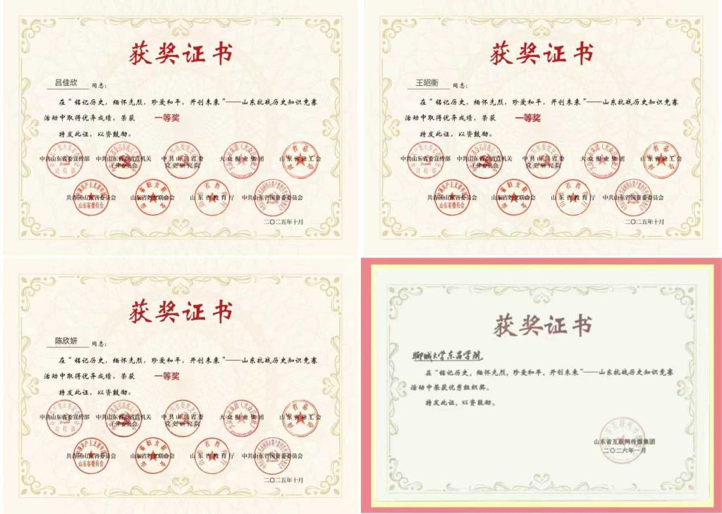 近日,我校在“铭记历史,缅怀先烈,珍爱和平,开创未来”山东抗战历史知识竞赛中喜获佳绩,参赛师生共有771人获奖,其中一等奖3人、二等奖81人、三等奖276人、优秀奖411人,学校荣获“优秀组织奖”。